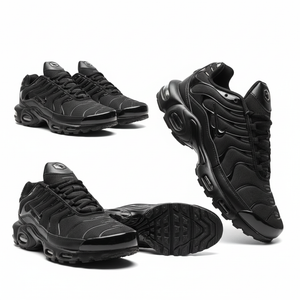 Zapatillas deportivas en color negro total, de diseño moderno y robusto. Confeccionadas en material textil tipo malla con refuerzos sintéticos que aportan transpirabilidad, soporte y durabilidad. Suela gruesa con cámara de amortiguación y excelente agarre para mayor comodidad en cada paso. Ideales para uso diario, caminatas y estilo urbano deportivo.